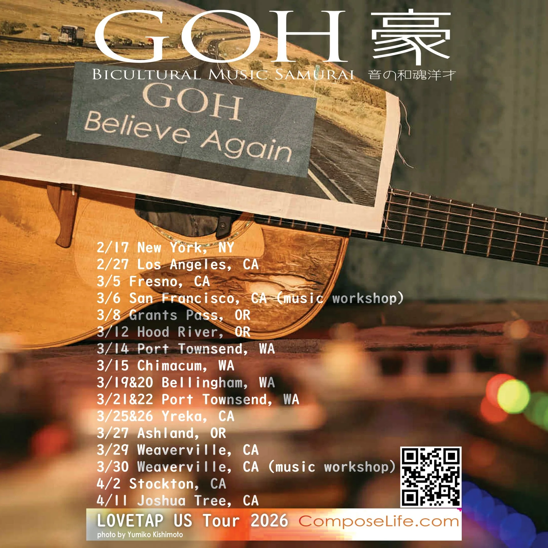音の和魂洋才と呼ばれてきているGohのツアータイトルはラブタップ・ツアー (前ブロークン・ツアー)で、音楽を命がけに演奏することより自分を表現して人々とふれあっています。